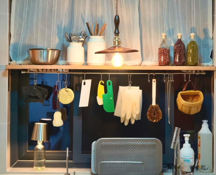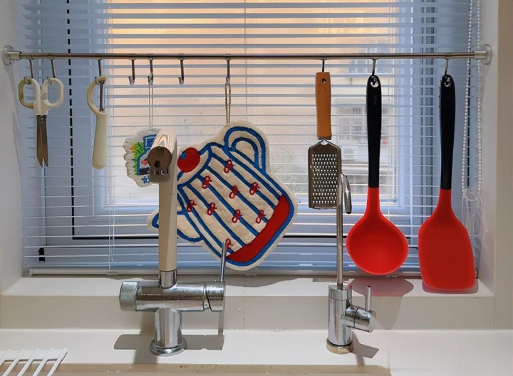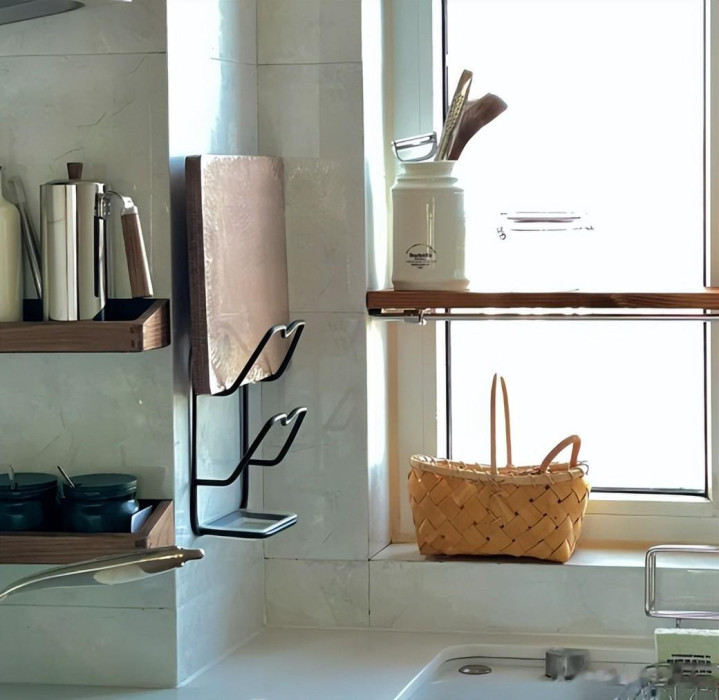 在窗户傍边不错作念上几个挂钩,故意去用来收纳一些小物件,比如清洁抹布、擦手巾等等。