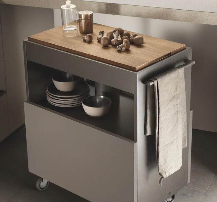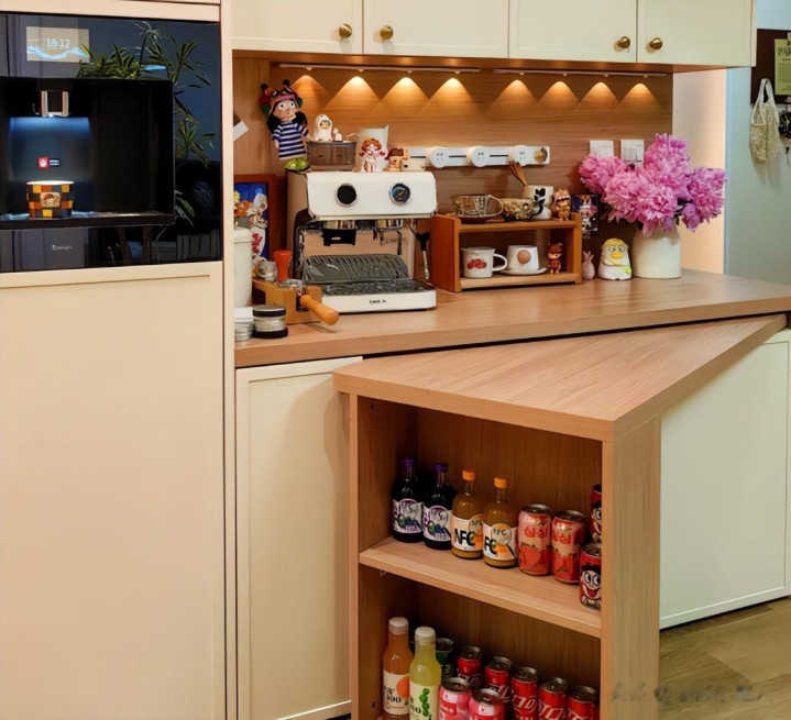 比如清水器、咖啡机、烧水壶等等,都能放上去,这两者搭配起来,能承担不少厨房收纳纳闷,要道是能移动的中岛台谋划,莫得任何卫死活角。