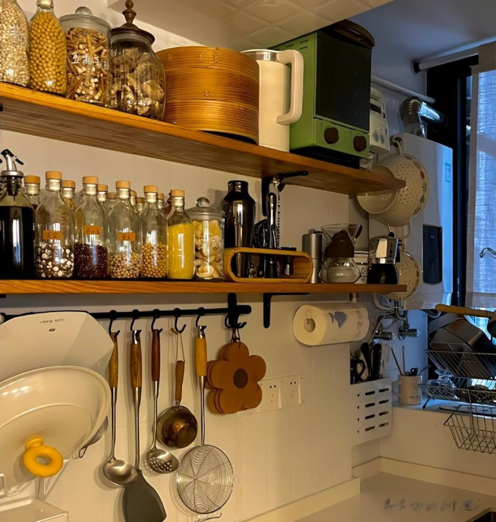 厨房装了吊柜,确凿能放东西,可占据了不少空间,上方的空间就这样浮滥了……
