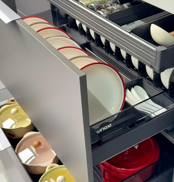 基本上常用的厨具都能放入到内部,什么碗碟、锅具、餐具等等,整皆的放到内部,很省事。