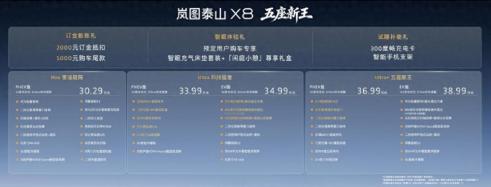 4月22日,岚图泰山X8认真开启群众预售,预售价30.29万—38.99万元,提供PHEV/EV双能源、5款建树,同步推出2000抵5000等多重预售权力,上市53分钟订单破1.5万台,平直引爆高端大五座阛阓。